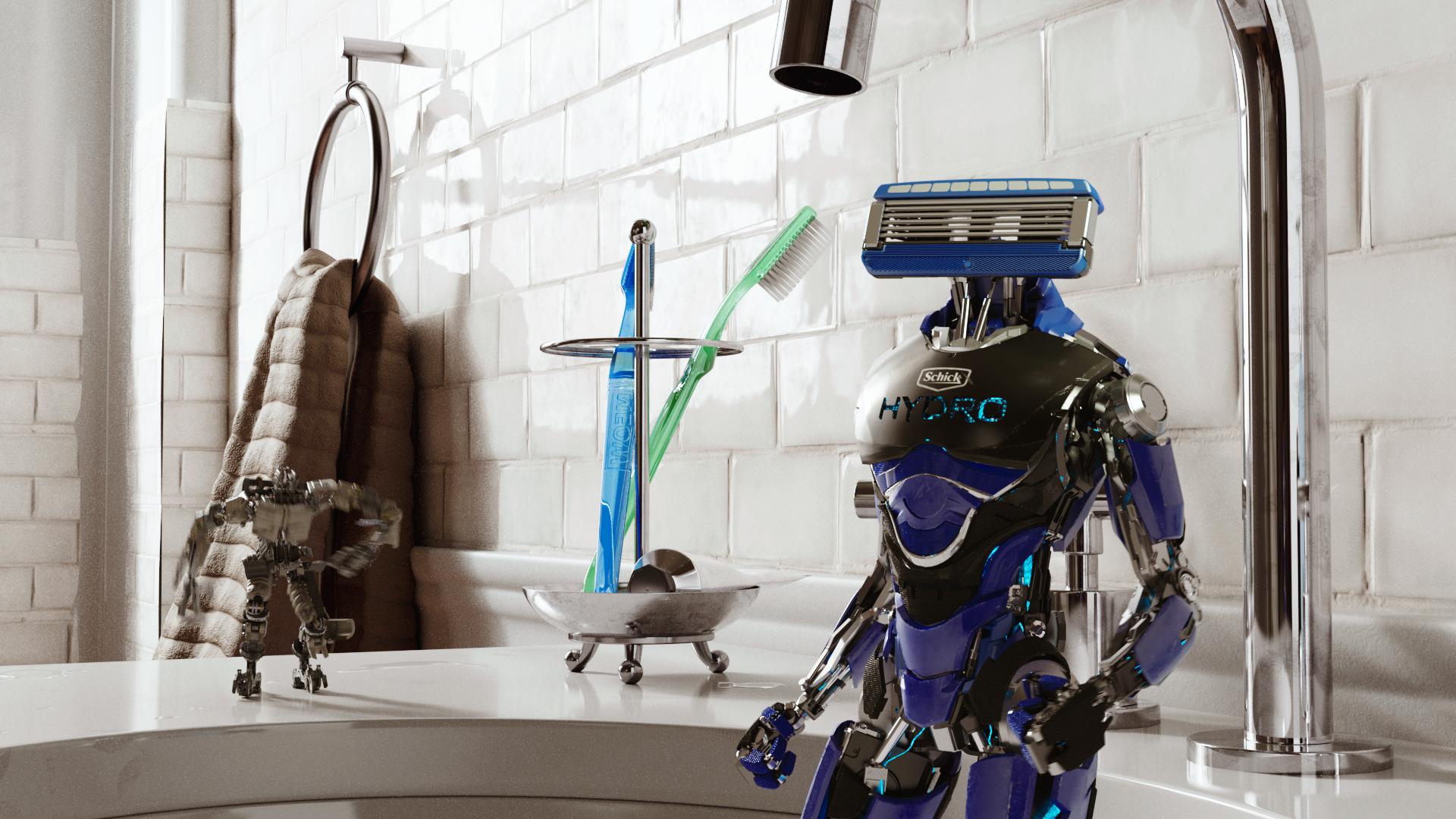 2016 super bowl commercial for schick featuring 2 robot characters battling against each other, spinning off 2 other spots